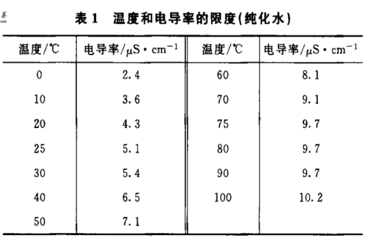 純化水可使用在線或離線電導(dǎo)率儀,記錄測定溫度。在表1中,測定溫度對應(yīng)的電導(dǎo)率值即為限度值。如測定溫度未在表1中列出:則應(yīng)采用線性內(nèi)插法計算得到限度值。如測定的電導(dǎo)率值、不大于限度值,則判為符合規(guī)定;如測定的電導(dǎo)率值大于限度值,則判為不符合規(guī)定